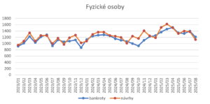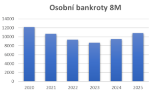 Za posledních 12 měsíců soudy v Česku vyhlásily 15 087 osobních bankrotů, což je oproti předchozímu období o 11 % více. V porovnání se situací za 8 měsíců se tempo růstu počtu osobních bankrotů letos zvyšuje. Růst mezd a zvyšování podílu nesplácených úvěrů naznačuje pokračování této tendence i v dalších měsících letošního roku.