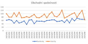 Graf: Bankroty a návrhy na bankrot obchodních společností 2023–2025 (zdroj: CRIF)