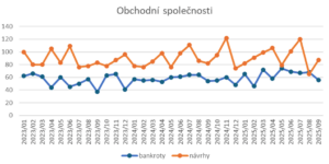 V posledních 12 měsících, tedy za období od loňského října do konce září, zbankrotovalo 737 obchodních společností. Oproti předchozímu období to bylo o 6 % více.